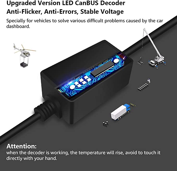 Diseñado para ser compatible con BMW Mni H4 LED. El súper decodificador Tectico está diseñado para ser compatible con BMW o Mini 12V usando bombillas H4 para faros delanteros, luces antiniebla o luces de circulación diurna. Súper Canbus. El uso de resistencia de carga y condensador, específicamente para resolver los siguientes problemas: las bombillas no funcionan, solo funciona una bombilla, parpadeo continuo, las bombillas se apagan cuando el motor arranca, código de advertencia de error. Por qué ocurren los problemas con el automóvil. Cuando actualice la lámpara halógena a una bombilla LED, hará que el sistema del automóvil lea el desequilibrio de potencia de la bombilla. 100% enchufar y usar. El diseño todo en uno no requiere modificación, instalación directa con bombillas LED y toma de corriente del automóvil. Antes de la instalación, determine el polo positivo y negativo de la bombilla LED. Atención. La resistencia se calienta durante el funcionamiento, no la toque directamente con la mano.