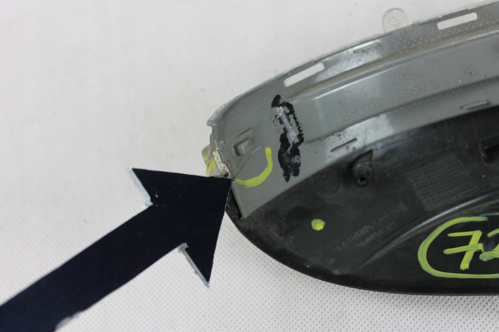 Se ofrecen carcasas de espejo intermitente delantero izquierdo para VW Golf VI numero 5K0949101A intermitente agrietado en buen estado como en la foto. Se adapta a otros modelos, lista en la subasta y varias versiones de motor. Precio por ítem.